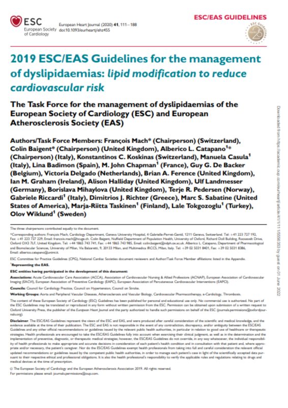 2019 ESC/EAS Guidelines for the management of dyslipidaemias: lipid modification to reduce cardiovascular risk