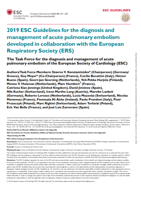 2019 ESC Guidelines for the diagnosis and management of acute pulmonary embolism developed in collaboration with the European Respiratory Society (ERS)