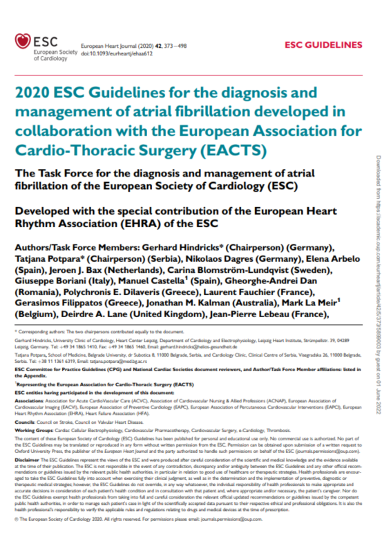2020 ESC Guidelines for the diagnosis and management of atrial fibrillation developed in collaboration with the European Association for Cardio-Thoracic Surgery (EACTS)