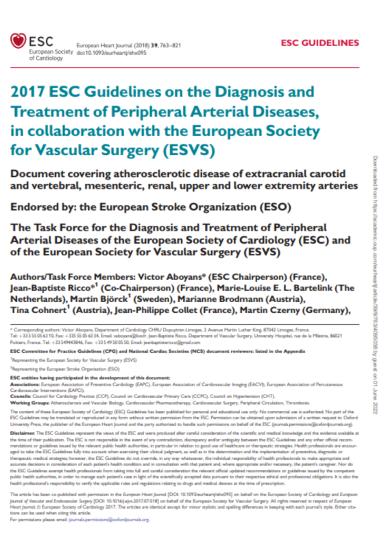 2017 ESC Guidelines on the Diagnosis and Treatment of Peripheral Arterial Diseases, in collaboration with the European Society for Vascular Surgery (ESVS)