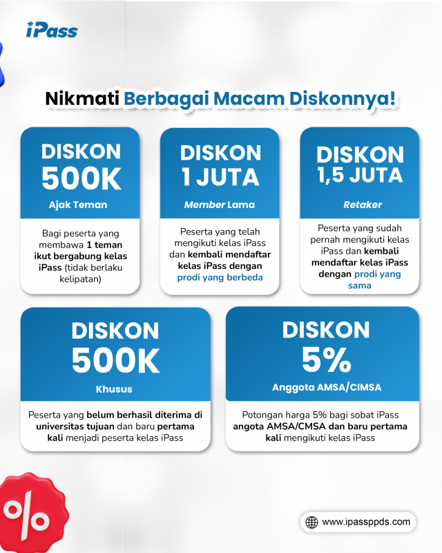 Sobat iPass dapat melakukan registrasi melalui website ipassppds.com dan menghubungi WA kami sesuai dengan prodi yang diinginkan.